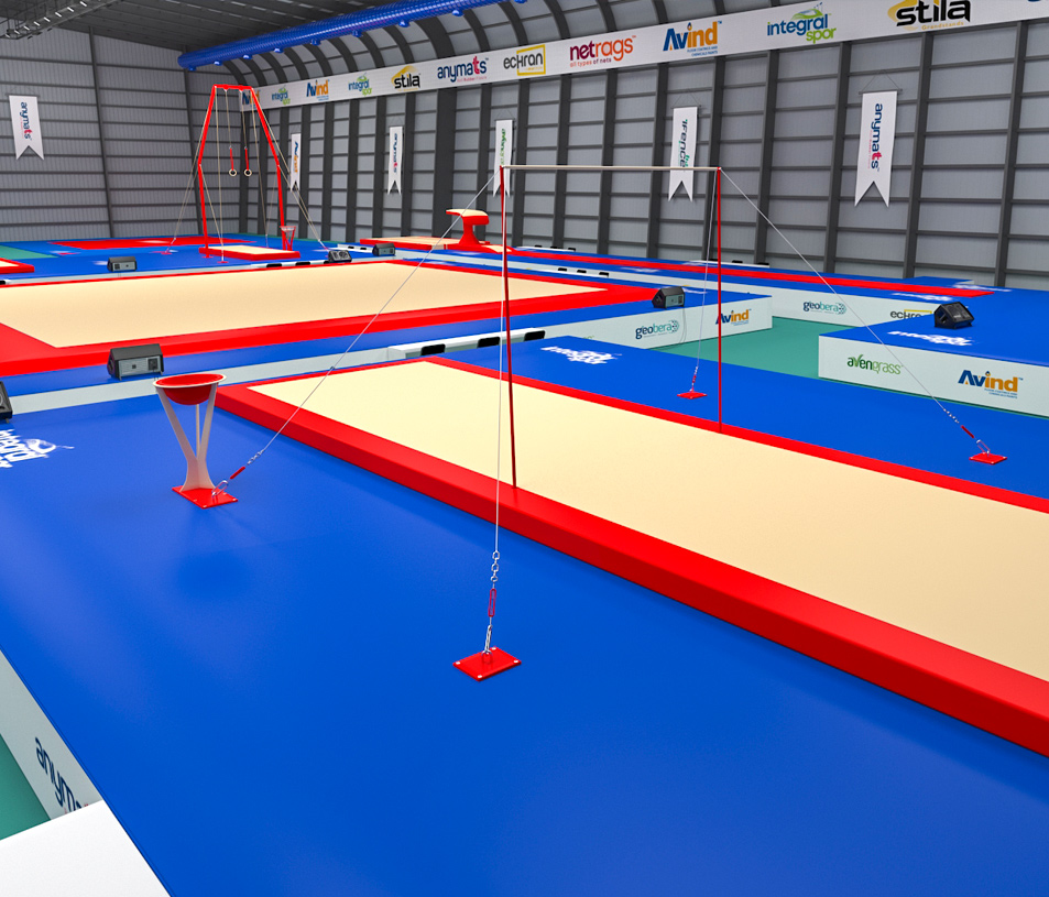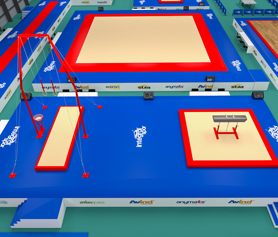 - La superficie del suelo que rodea las colchonetas deportivas en interiores está diseñada para ser lisa, antideslizante y permitir que los atletas se muevan con comodidad.
