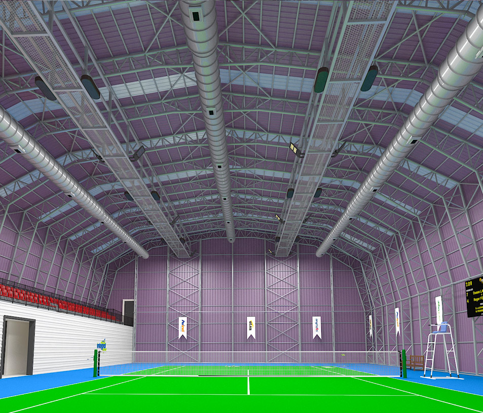 Las pistas de tenis pueden construirse como campos al aire libre, pabellones deportivos cubiertos o bajo estructuras de acero cubiertas con PVC transparente. De este modo, se garantiza una experiencia de juego ininterrumpida durante las cuatro estaciones. Además, se integran gradas especiales, áreas de observación y sistemas de iluminación en las canchas para crear instalaciones completamente equipadas.