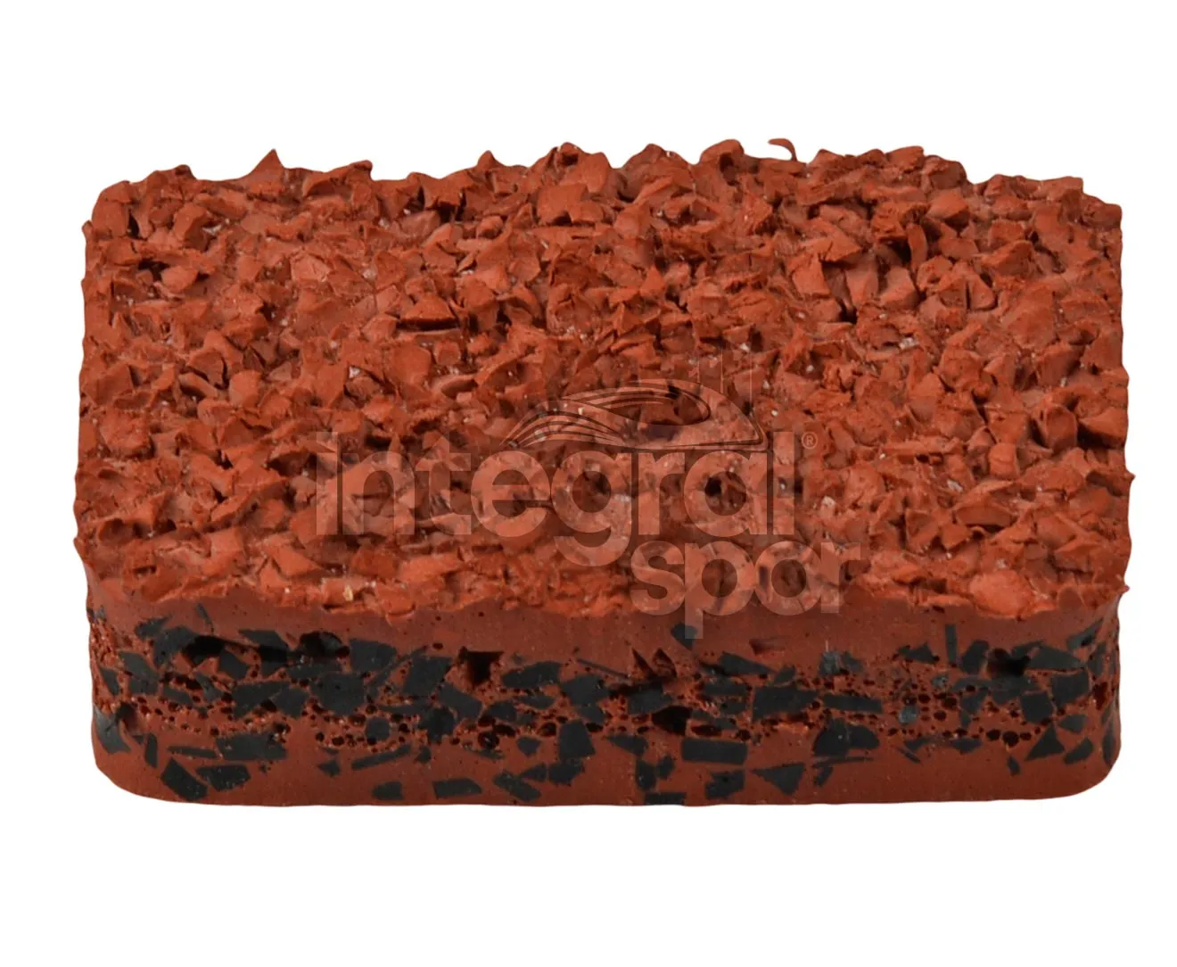 En la primera capa, se aplica uniformemente 3 kg/m² de PU autonivelante con llana dentada. Mientras el PU está húmedo, se espolvorea 2.5 kg/m² de granulado SBR encima y este proceso se repite una vez más. Luego, se aplica uniformemente 3 kg/m² de PU autonivelante con llana dentada. Mientras el PU está húmedo, se espolvorea 2.8 kg/m² de granulado EPDM encima. Al día siguiente, se recoge el EPDM no adherido y se trazan las líneas.