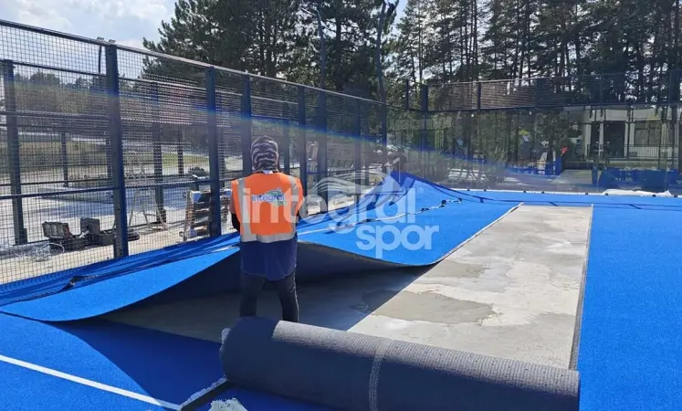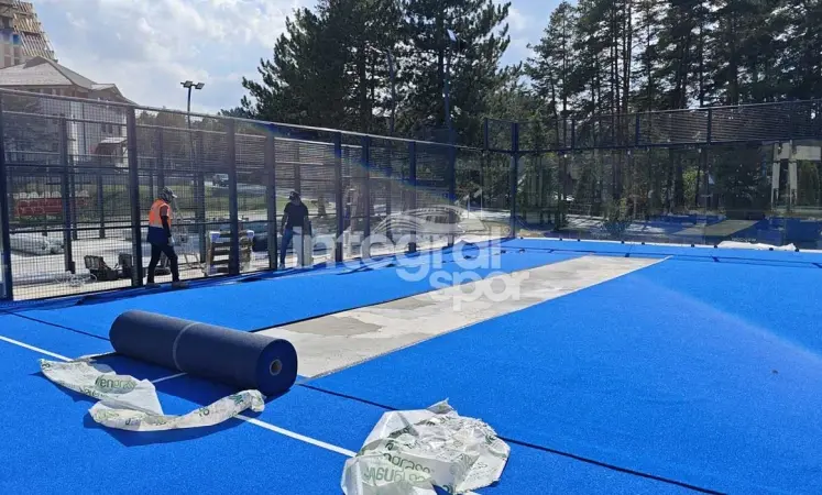 Pour le revêtement du sol, nous avons utilisé du gazon de padel bleu de la marque Avengrass, une marque d'Integral Spor. Ce gazon spécial, avec sa texture antidérapante et sa structure douce, permet aux athlètes de se déplacer confortablement et améliore la performance du jeu. Le choix de la couleur bleue facilite également le suivi de la balle.